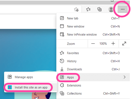 Click the ⋯ icon, then choose Apps, then choose Install this site as an app.